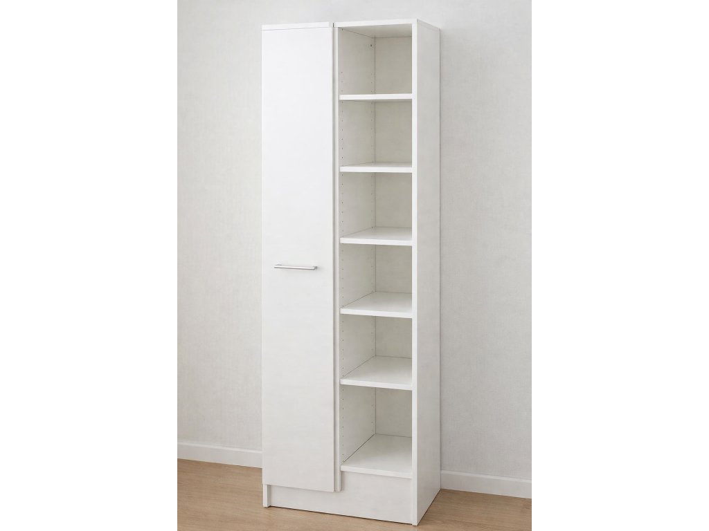 Elegantná vysoká skrinka v bielej farbe ponúka praktickú kombináciu uzavretého úložného priestoru a otvorených políc. Ilustračné foto, reálne foto na krabici.