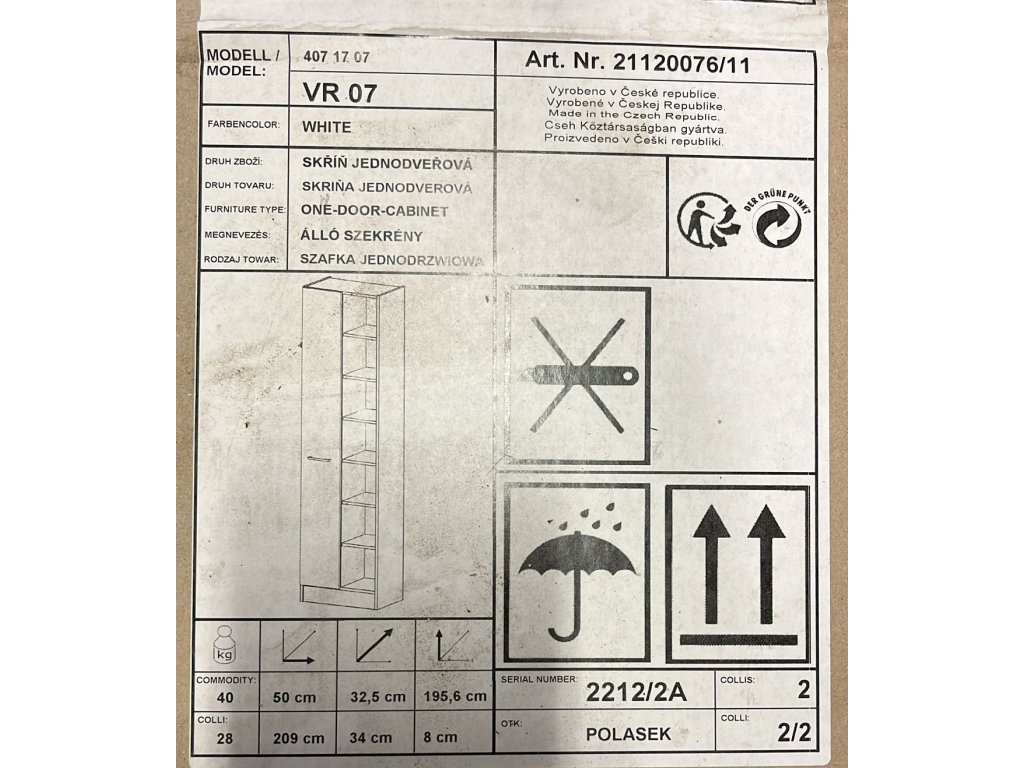 Rozměry: šířka 50 cm, hloubka 32,5 cm, výška 195,6 cm