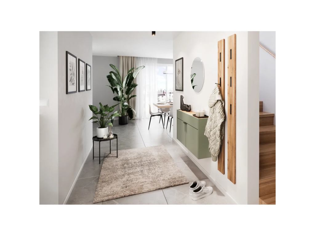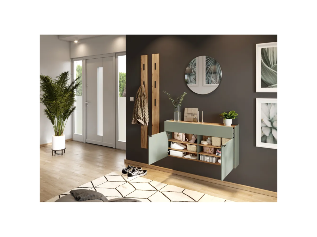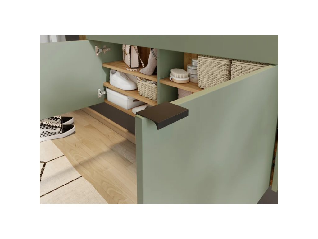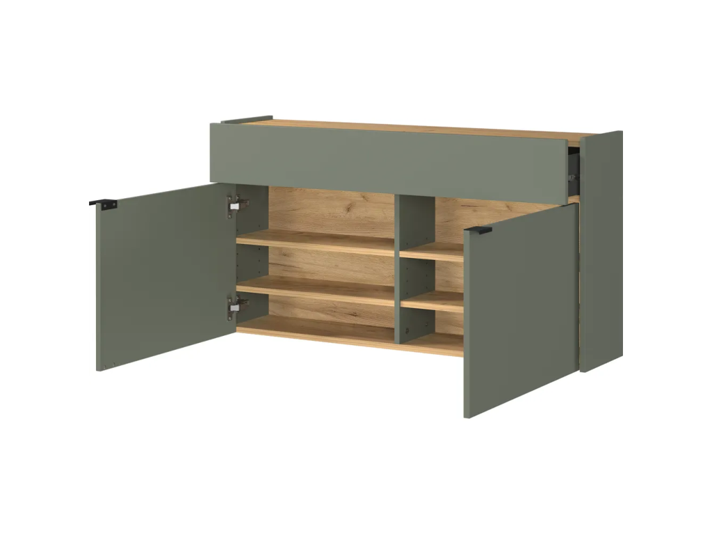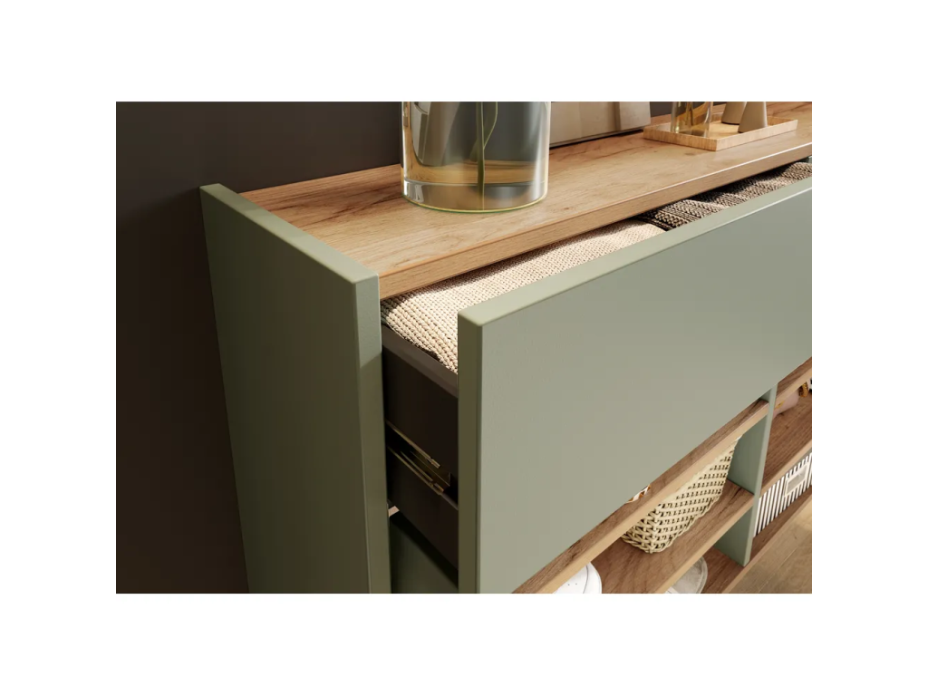 Z drevotriesky, povrchová úprava: melamín, šalviovo zelená, šírka 110 cm, výška 57 cm, hĺbka 22 cm.