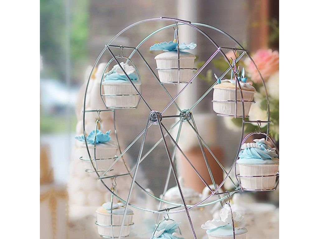 Stylově vystavte své dezerty s tímto dekorativním stojanem ve tvaru panoramatického kola od značky BAKAJI. Robustní kovová konstrukce a leštěný stříbrný povrch dodají vašemu stolování profesionální a slavnostní vzhled, zatímco osm pevných míst umožní přehledné a efektní uspořádání cupcakes či muffinů.