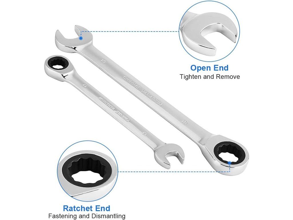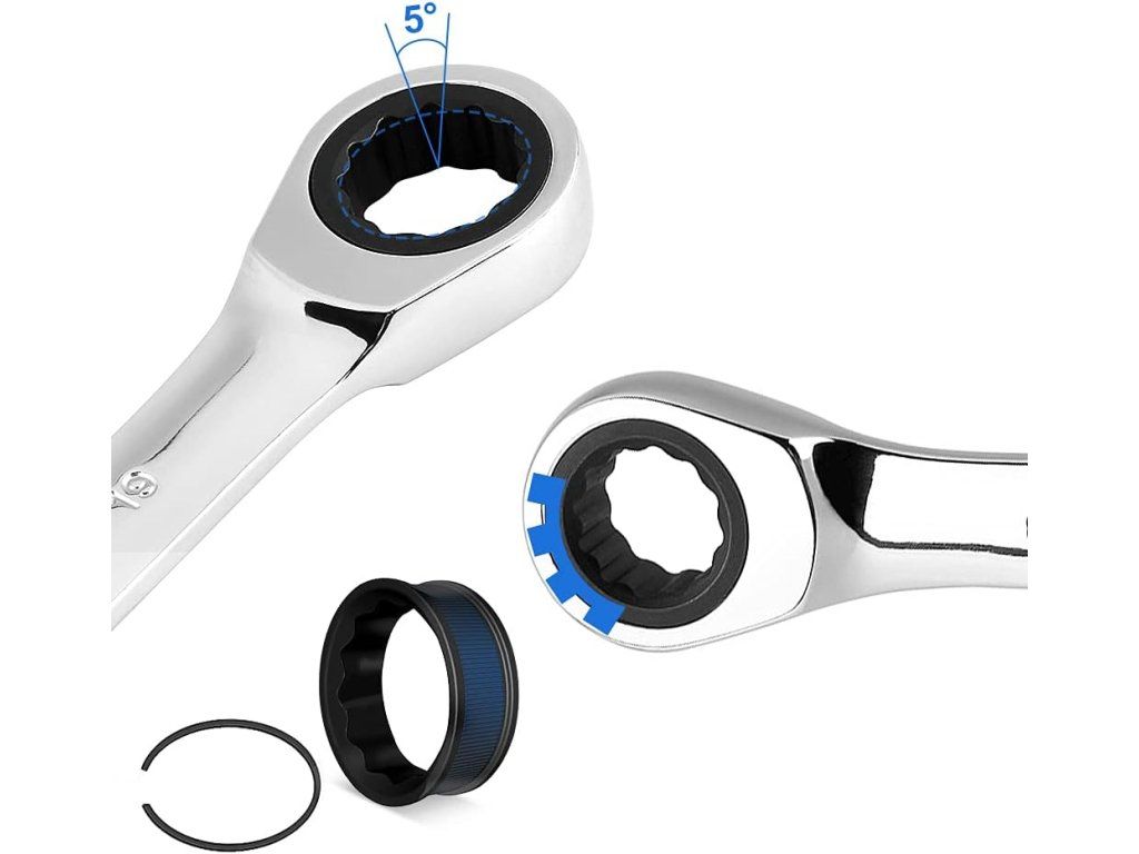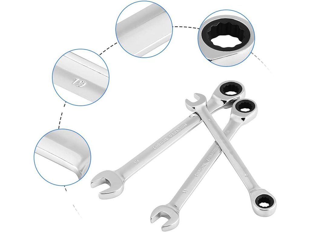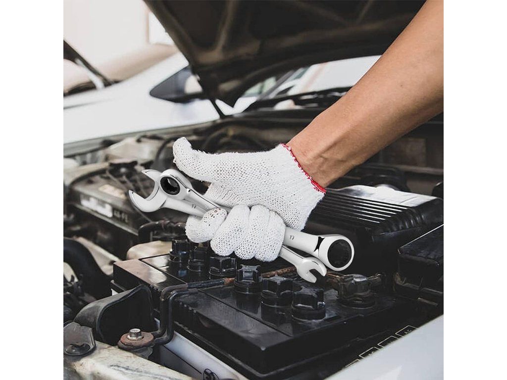 Robustná sada 12 kombinovaných račňových kľúčov z chróm-vanádiovej ocele (8–19 mm) pre prácu v tesných priestoroch. Račňa s 72 zubami a 5° návratným uhlom zaisťuje rýchle a presné uťahovanie bez poškodenia hrán skrutiek.