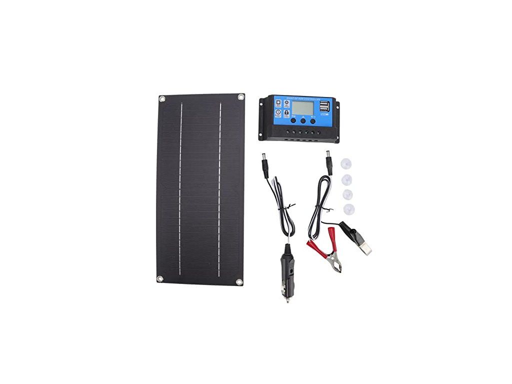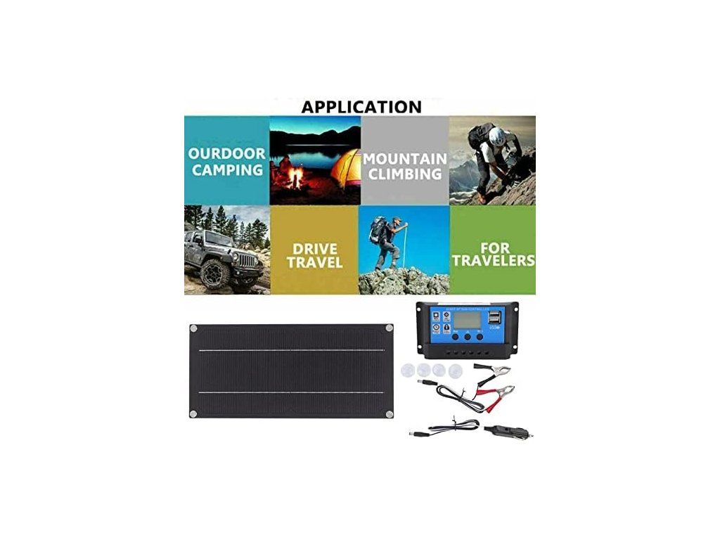 Obsah balení: 1× solární panel, 1× regulátor nabíjení, 1× svorka, 4× přísavky, 1× připojovací kabel, 1× návod (možná v cizím jazyce). Technické údaje: materiál monokrystalické křemíkové články; rozměr solárního modulu 300 × 145 mm; rozměr regulátoru 132 × 68 × 30 mm; hrubá hmotnost 415 g; jmenovitý výkon 600 W; napětí solárního modulu 18 V; regulátor: 12 V / 24 V; maximální proud regulátoru 100 A; připojení: USB (údaj z popisu výrobce).