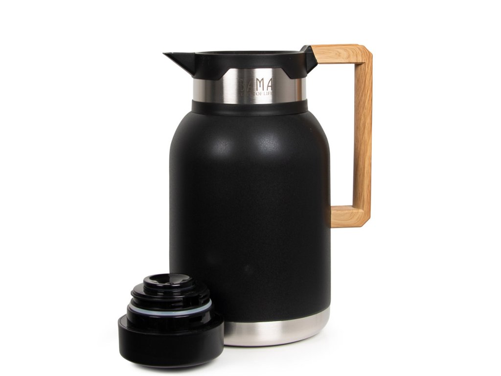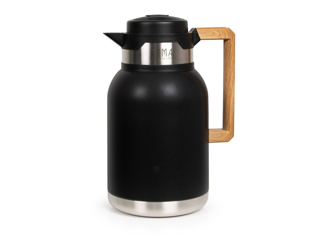 Matně černá konvice a unikátní zkosená dřevěná rukojeť zajišťují pohodlný úchop. Tato atraktivní termoska má objem 2 litry , takže je ideální pro servírování teplých nápojů na večírcích nebo setkáních. Tyto velké termosky jsou ideální po celý rok, ať už si vychutnáváte zimní kávu na letním pikniku. Dvoustěnná termoska z nerezové oceli se šroubovacím víčkem udrží nápoje teplé po dobu 12 hodin a studené nápoje vychlazené po dobu 24 hodin.