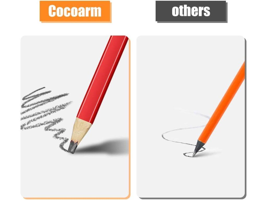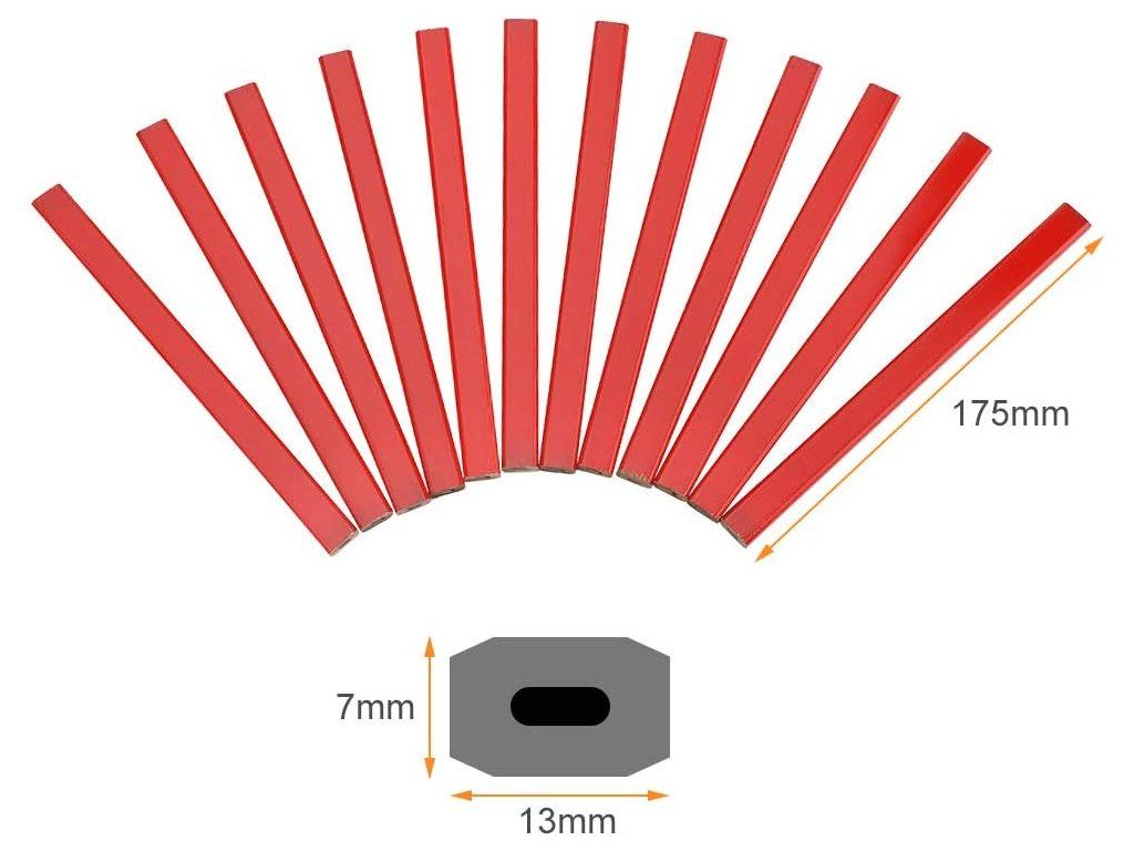 Súprava 72 červených tesárskych ceruziek s odolnou čiernou tuhou (tvrdosť H) pre presné a jasné značenie na drevo. Osemhranné telo, mierka na zadnej strane a výrazná farba uľahčujú prácu a znižujú potrebu častého orezávania.