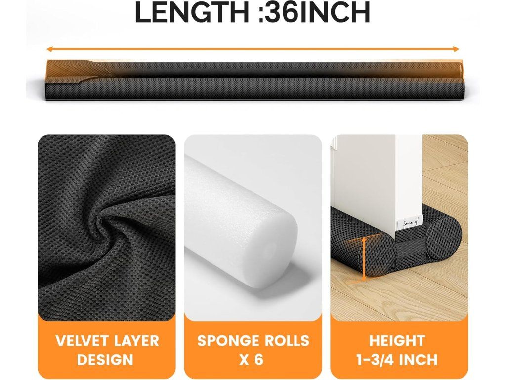 Obsah balení: 1× těsnění pod dveře 36" (91 cm) v černé barvě a přiložený přilepovací suchý zip. Technické údaje: materiál polyesterová vlákna, maximální vyplnění spáry do 1,7" (cca 4,3 cm), rozměry 36" × 2" × 2" (91 × 5 × 5 cm), barva černá.