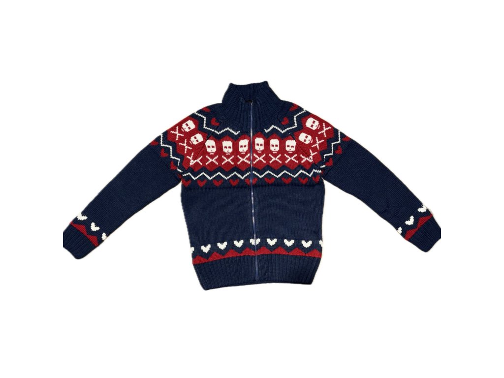 Výrazným prvkem svetru je bílý vzor lebek. Praktické zapínání na zip.