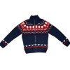 Hrejivý pletený sveter v modrom prevedení je doplnený červeným a bielym vzorovaním.