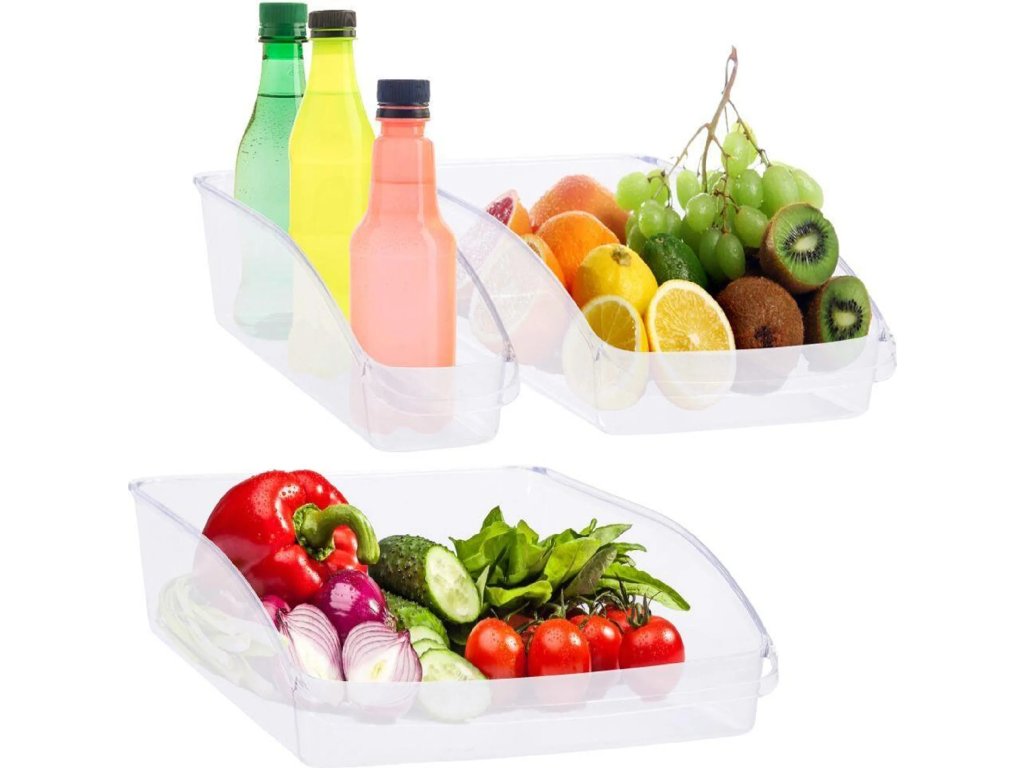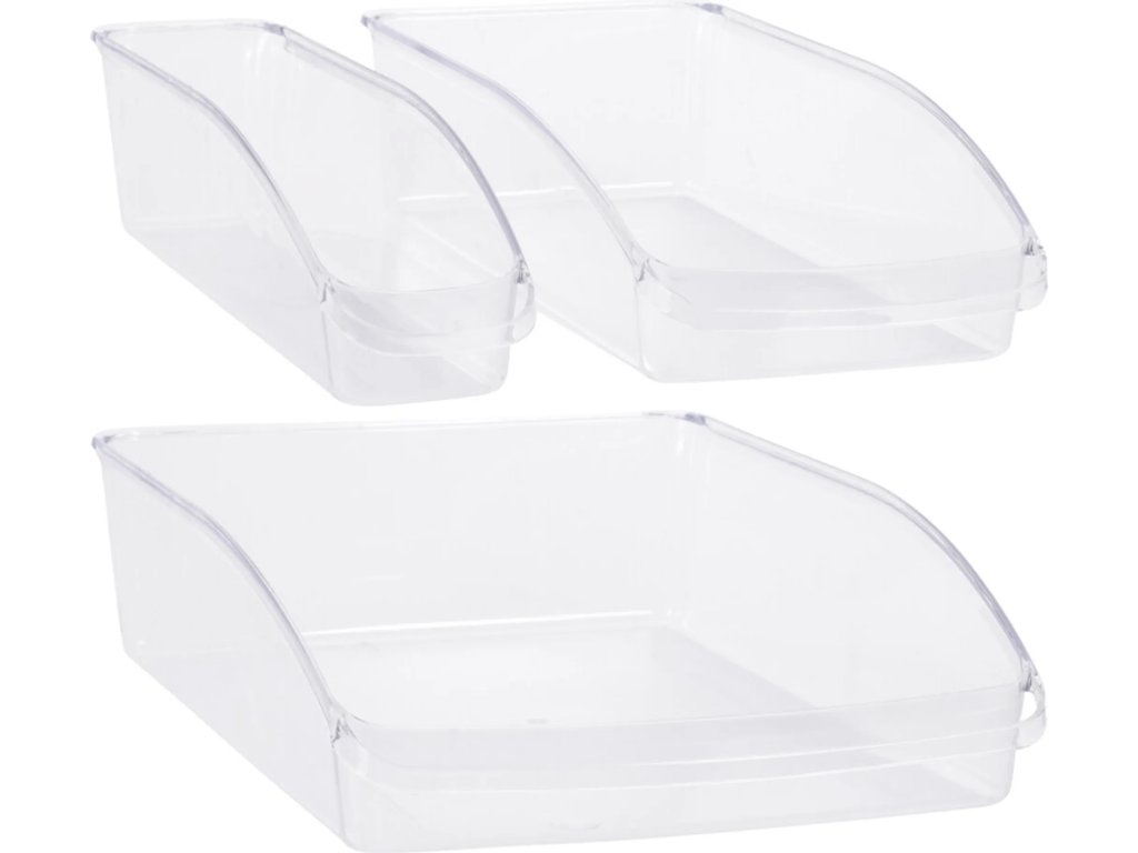 Súprava troch praktických organizérov do chladničky z priehľadného plastu od Excellent Houseware. Malý (33x7,3x8 cm), stredný (33x15x8 cm) a veľký (33x23x8 cm) kontajner zaistí poriadok na policiach a uľahčí vyberanie potravín. Možno umývať v umývačke riadu.