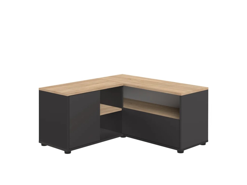 Rohový, v dekore duba, z drevotriesky, povrchová úprava: melamín, čierny/v prírodnej farbe, šírka 90 cm, výška 45 cm, hĺbka 90 cm.
