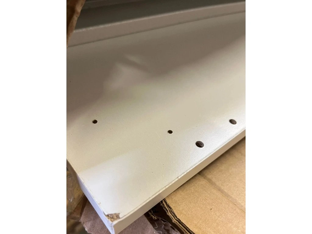 Z drevotriesky, povrchová úprava: fólia, matný, biely, šírka 117 cm, výška 61 cm, hĺbka 39 cm. POŠKODENÁ BOČNICA Z VNÚTORNEJ STRANY POZRI FOTO.