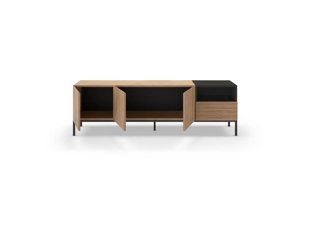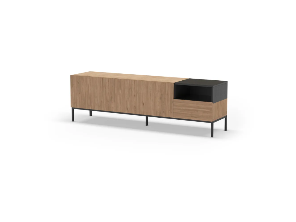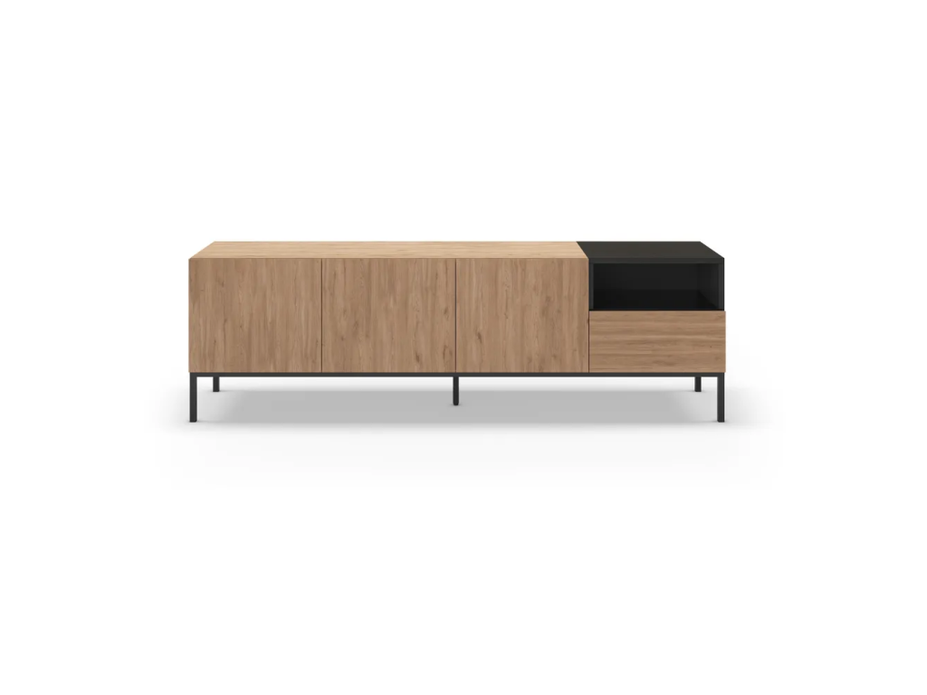 Barva Přírodní Šířka 180 cm Výška 55 cm Hloubka 42 cm Váha 38.48 kg Výška nohou 17.5 cm Materiál MDF Dekor Dub Barva dřeva Světlé dřevo Povrchová úprava Melamin Materiál nohou Kov Barva nohou Černá Vlastnosti Se šuplíky, s dvířky, s poličkami, na nožičkách Péče Čistit vlhkým hadříkem nebo houbičkou, nepouživat agresivní a abrazivní čističe Systém zavírání Soft close (tiché dovírání)