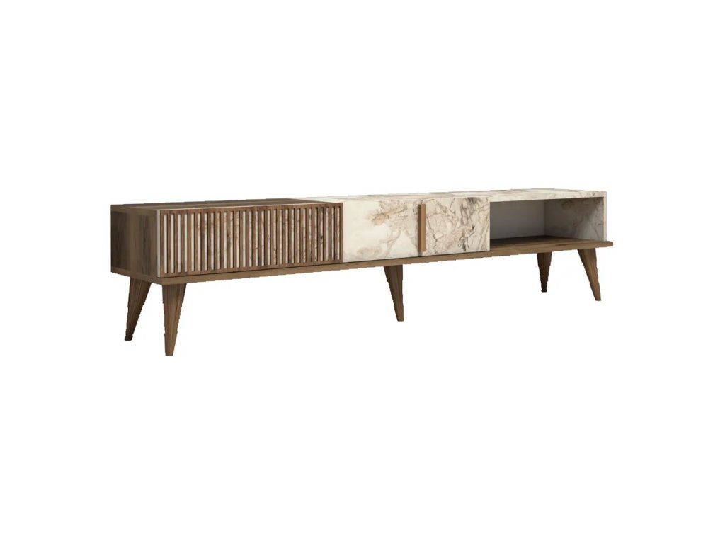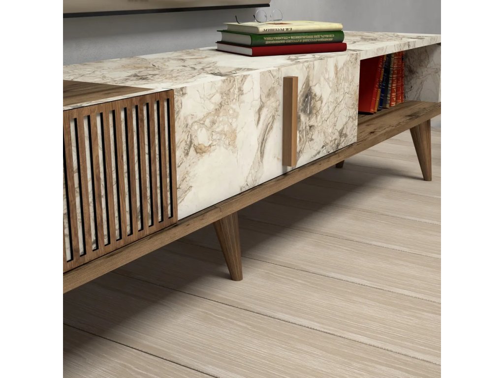 V dekore mramoru, z MDF, povrchová úprava: melamín, v prírodnej farbe, šírka 180 cm, výška 40 cm, hĺbka 35 cm. POŠKODENÁ SPODNÁ DOSKA ZO ZADNEJ STRANY.