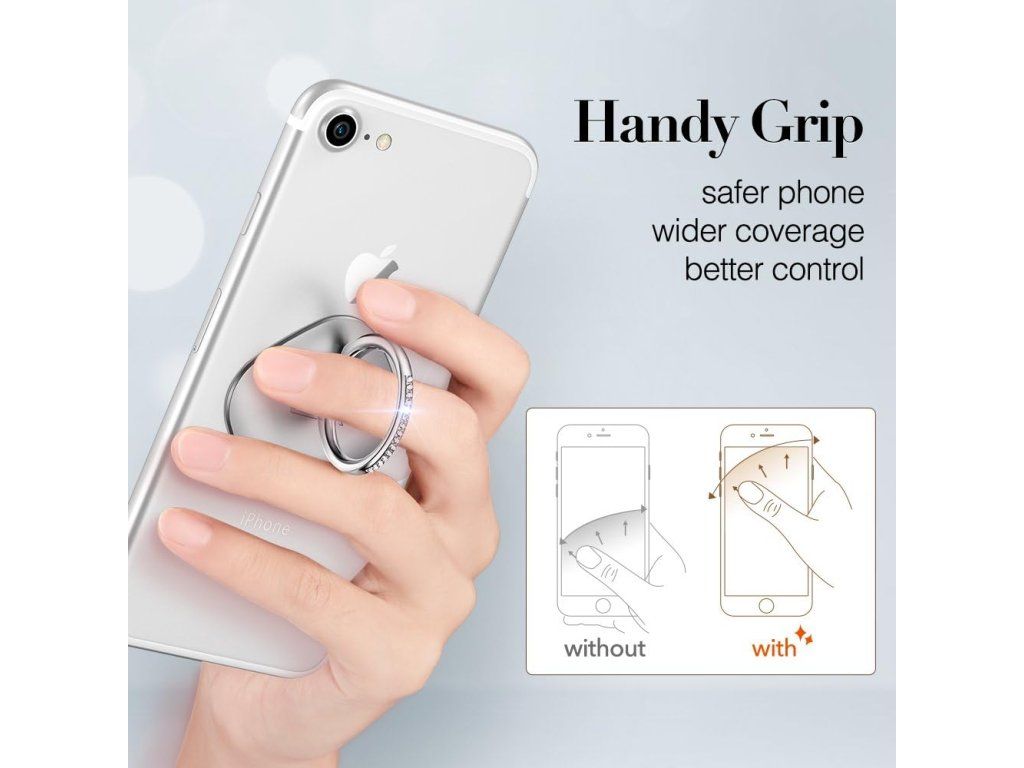 Štýlový prstový držiak ESR s otočným hliníkovým krúžkom a kryštálovým zdobením. Poskytuje bezpečné držanie telefónu jednou rukou a funguje aj ako praktický stojan. Jednoduché samolepiace uchytenie na všetky typy mobilných zariadení. Rozmery 40×9×40 mm.