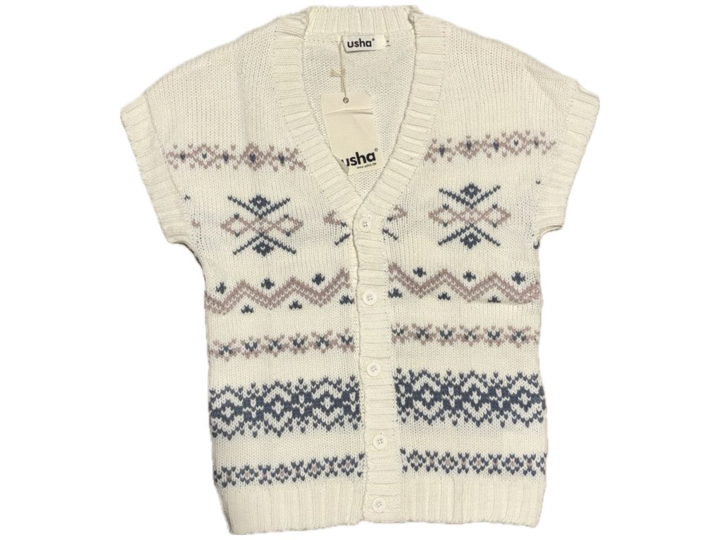 Štýlová pletená vesta so vzorovaním. Výstrih do písmena V. Krátke rukávy a zapínanie na gombíky.