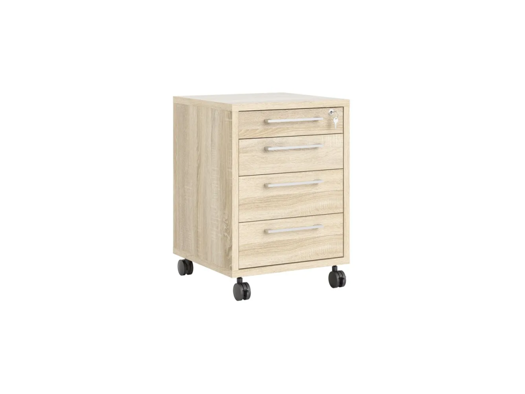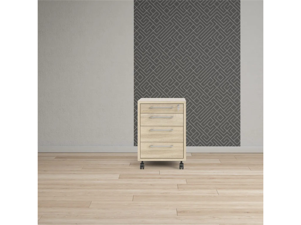 Uzamykateľná/na kolieskach, v dekore duba, z drevotriesky, povrchová úprava: melamín, v prírodnej farbe, šírka 48 cm, výška 68 cm, hĺbka 49 cm. POŠKODENÝ ROH Z VNÚTORNEJ STRANY A PRASKLINA NA ŠUPLÍKU Z VNÚTORNEJ STRANY.