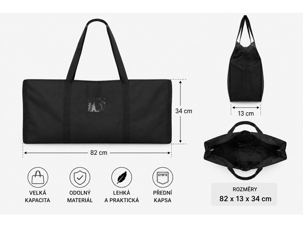 Tato stylová černá taška přes rameno nabízí maximální praktičnost a dostatek prostoru pro všechny vaše věci. Díky rozměrům 82 × 13 × 34 cm poskytuje velkou kapacitu, kterou oceníte při cestování, sportu nebo každodenním nošení.