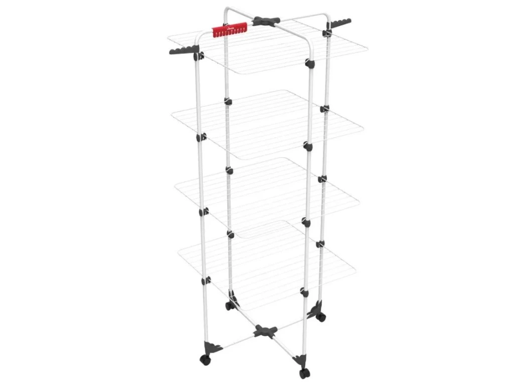- Díky nezávislým roštům, které mohou být použity jako zcela otevřené – pro sušení dlouhých oděvů a delikátního prádla – nebo polo-složené a přisunuté, například u stěny nebo radiátoru, pokud máte malé množství prádla a potřebujete ušetřit místo.