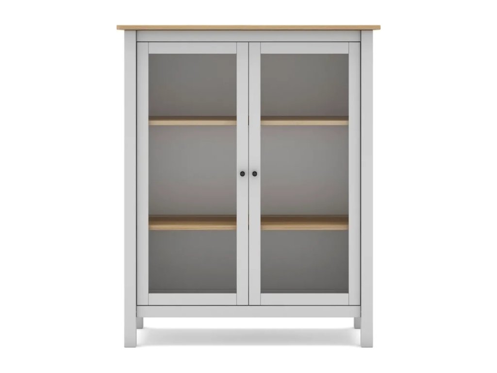 Z borovicového dreva, povrchová úprava: lak, biela, šírka 90 cm, výška 110 cm, hĺbka 40 cm. Nemá pôvodný obal, chýba 1x sklo do dvierok.
