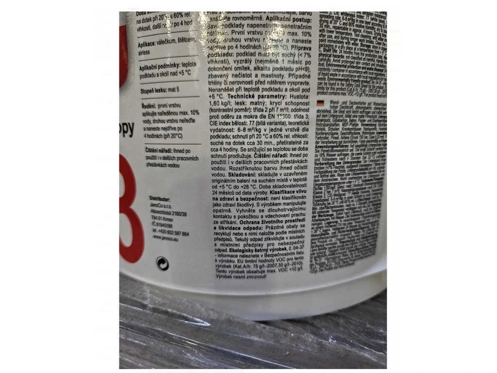 Technické parametry: Hmotnost 51 kg, bílá báze 1, disperzní složení pro interiérové použití. Barva je vhodná pro všechny běžné podklady jako omítky, sádrokarton nebo dřevo.