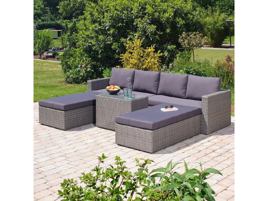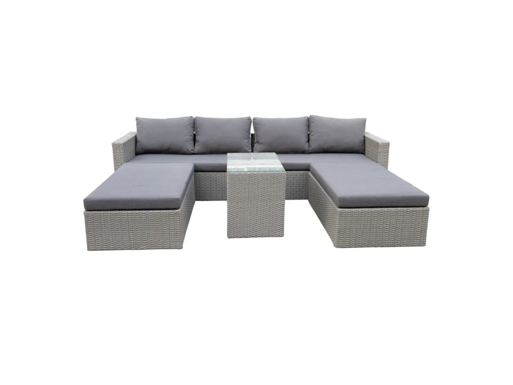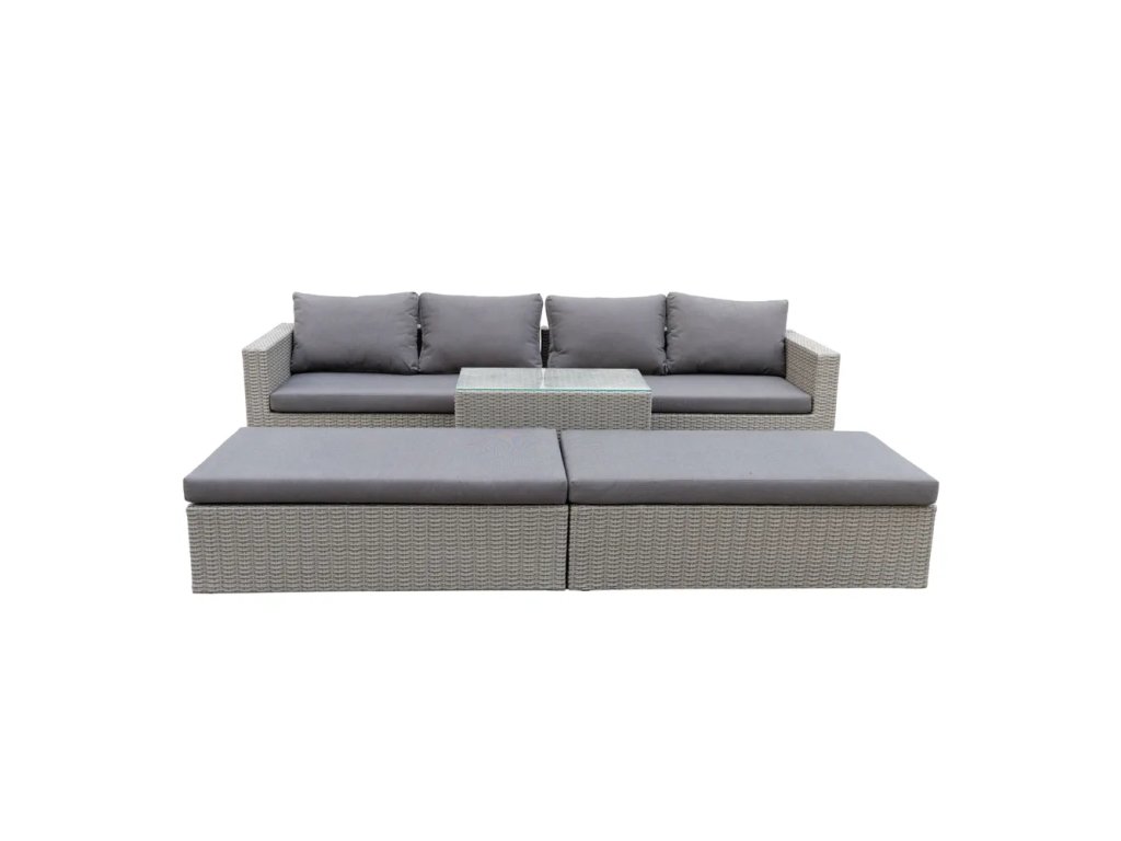 Barva Šedá Počet kusů 5 ks Počet osob Pro 4 Šířka 258 cm Výška 58 cm Hloubka 75 cm Váha 49 kg Nosnost 400 kg Materiál čalounění Látka Materiál Kov , umělý ratan Materiál konstrukce Ocel Materiál konstrukce Ocel Výplň Molitan (PUR) Péče Pravidleně vysávat s vhodným nástavcem na čalouněný nábytek, čistit vlhkým hadříkem nebo houbičkou, nepouživat agresivní a abrazivní čističe Snímatelný potah Ano